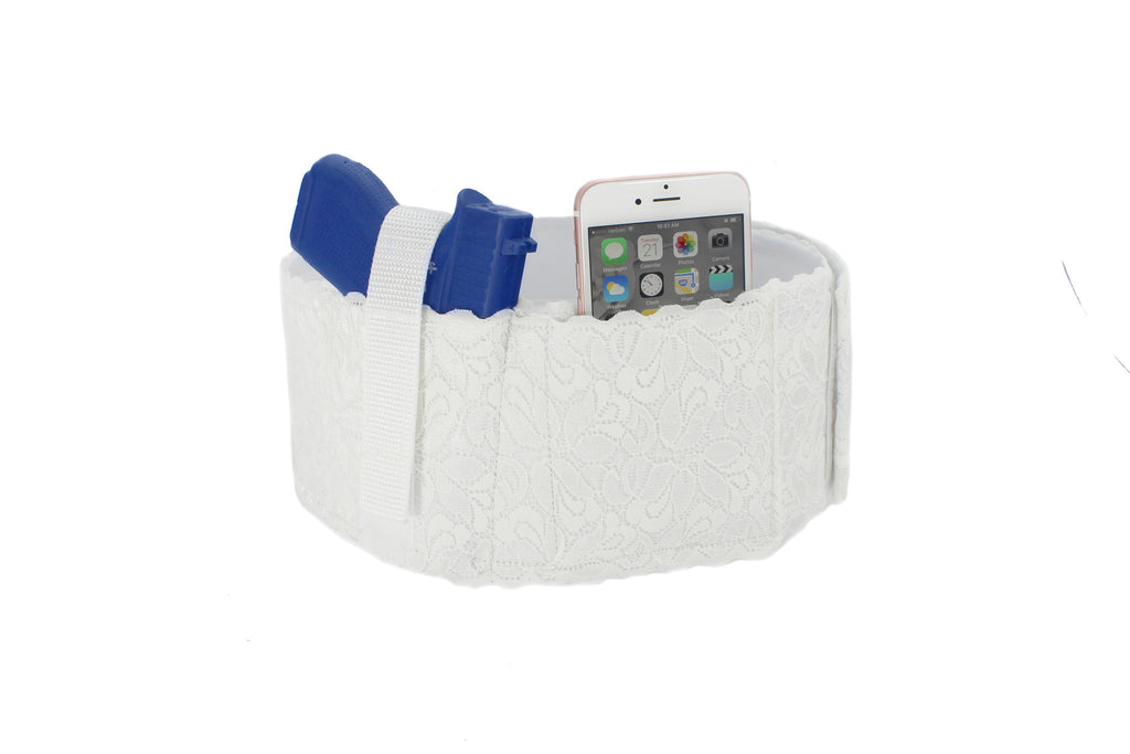 Our Lace Belly Bands are made for women by women who carry. Comfort-Wear elastic stretches around your waist to conceal one handgun and your choice of adding an accessory pocket. New design allows for quick and easy reholstering with our exclusive reholstering tab design; comes standard on all belly bands. Great for activities that require more movement or for deep concealed carry. Great midsection support and does not roll over. Belly bands offer extreme versatility as they can be worn and turned anywhere around your waist to position the gun in the front, on the side, cross-draw, and right or left hand.