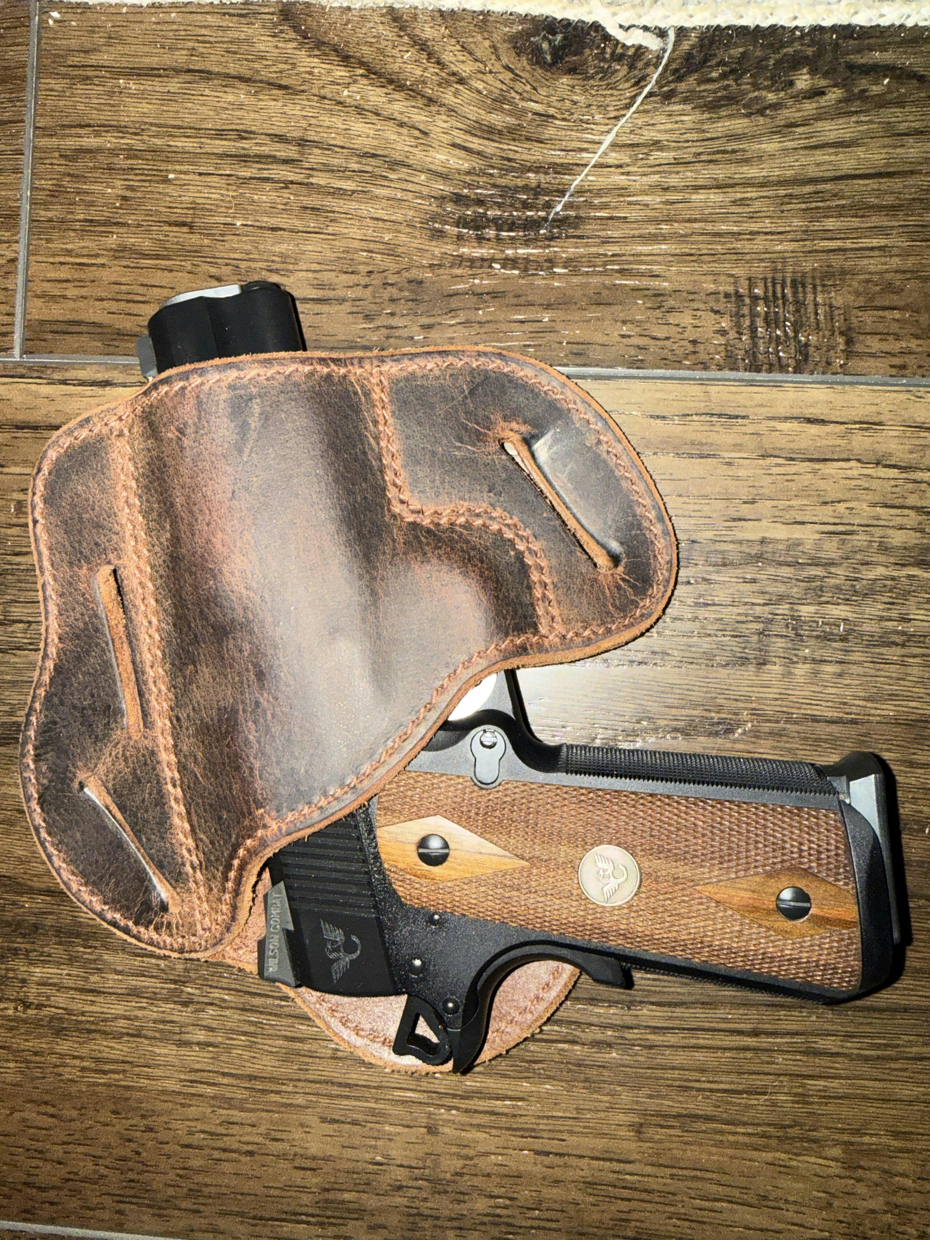 This belt slide concealed carry holster is crafted from premium leather right here in the USA. This style is unique because it offers variety in the angle for your CCW depending your needs that day. Carry horizontally or tipped forward for easy access to the gun. Contour molding on the front of the holster provides secure grip. Carry on your side hip comfortably with a leather sweat guard to prevent the holster digging into your side. Offered in left or right hand orientations and is available in Black, Dark Brown, and Golden Brown. Fits most 1911 Style Handguns.