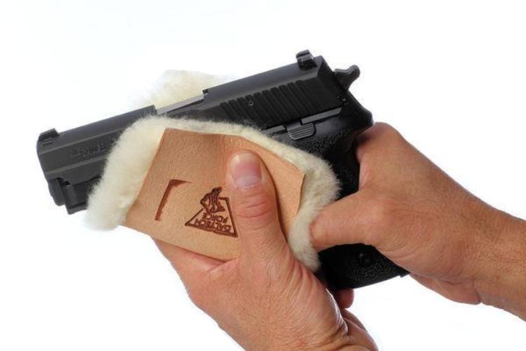 Sheepskin Gun Cleaning & Buffing Cloth. 100% all natural un-dyed sheepskin hide. Cut out of USA full hides in our leather shop. No globs of grease or solvents applied - You add your preference. Buy two! Add solvent to one and keep the other clean for buffing. Hard to find old-fashioned cloth known for its unique qualities. Great for buffing off fingerprints and for leather too. The best gun cleaning cloth is always a sheepkin. Will last a lifetime.